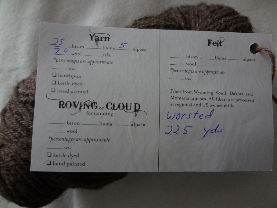 It’s 70% Rambouillet which is one of the softest wools with high crimp for warmth and bounce, 25% bison which is strong, light, warm, and soft with a micron count comparable to good cashmere, and 5% Suri which is strong, light, warm, and soft. There are two types of alpacas, and Suri makes up only about 10% of the total population. – Heather