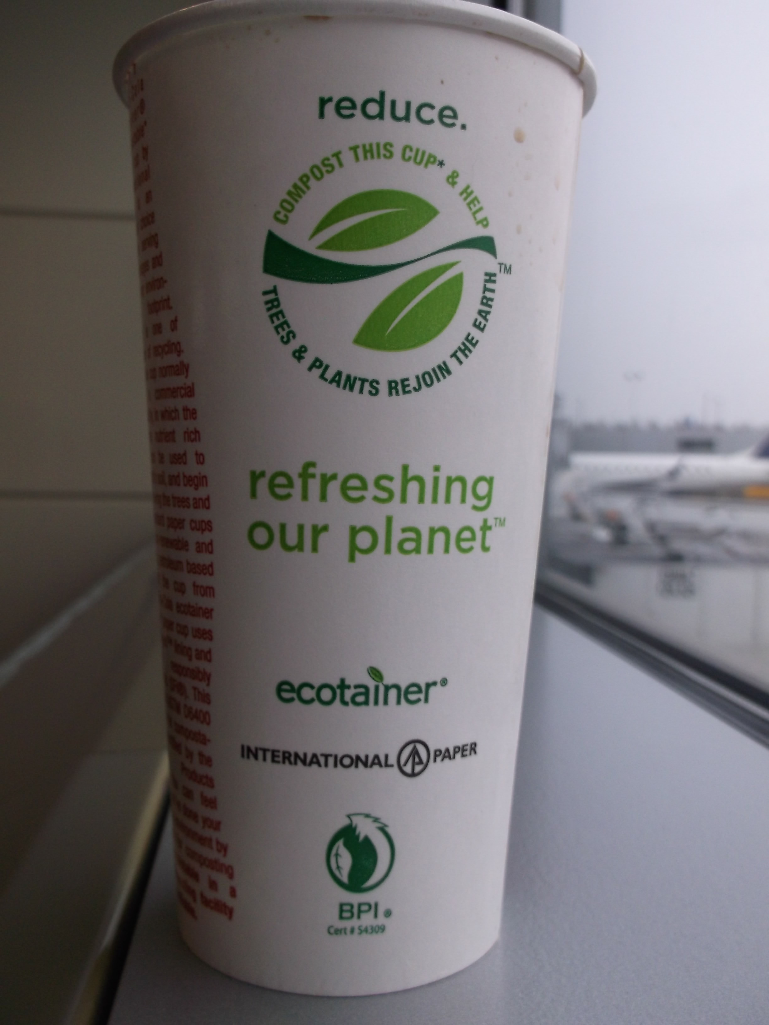 1] Tastes great 2] Refreshing 3] Certified BPI (Biodegradable Products Institute) cup 4] Meets ASTM D6400 for compostability! 5] SFI Sustainable Forestry Initiative paper!