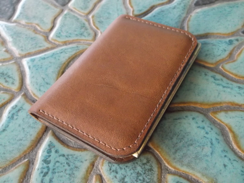 Within the orbit of American Toolbox the right craftsperson enters. Michael Hicks Design, starting up his leather craft business in ernest, listens to my needs. Offers multiple combinations of the finest ¾ oz Horween Chromexcel horse leather. Sends a couple sample card cases for comment. In no time, the finished product. How timely!