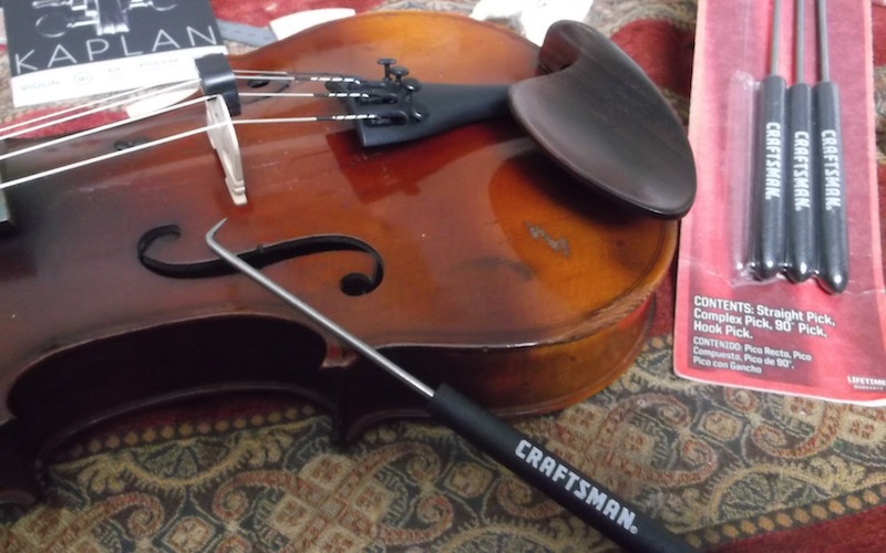 Its tip handles the job without complaint, bending, or chipping. Of note, the pick tip would not insert far enough through the turn bolt hole to scrape the violin ribs if one worked without care. All situations are different. Gouge fine wood in haste, repair at leisure. These are rugged tools for delicate jobs. Further inquiry reveals a range of Craftsman hook and pick sets for all occasions.