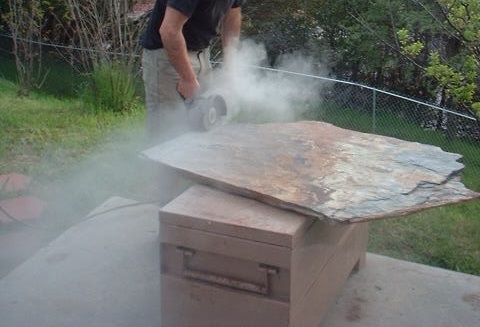 Mariposa Flagstone Co/Yosemite Slate Quarry. They had the goods. And just the right piece, a monster leaning against a tree, waiting for the right pockets to come along and buy it. The rest is history. Dragged it home in the Ford, made a template, dry-cut the stone with a diamond wheel on a Craftsman grinder, and dressed the edging.
